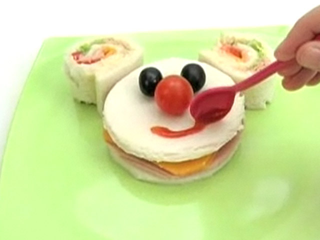 Вкусный бутерброд необычной формы.Состав:тунец — 1 порция;ветчина — 2-3 кусочка;сыр — 2-3 кусочка;помидоры черри — 5 штук;кетчуп — 1 столовая ложка;маслины — 2 штуки;хлеб — 2 кусочка;майонез, салат латук.
